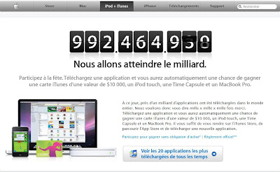 Informations Apple : Tirage au sort par admin22/04/2009 Je vous avais parlé du tirage au sort organisé par Apple pour la milliardième application et bien le compteur est très proche des 1 000 000 000 !!