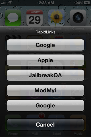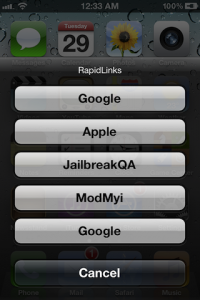 Le nom et l’url des liens devront être saisis dans Réglages > RapidLinks. N’oubliez pas d’assigner une action pour l’utilisation du tweak.
